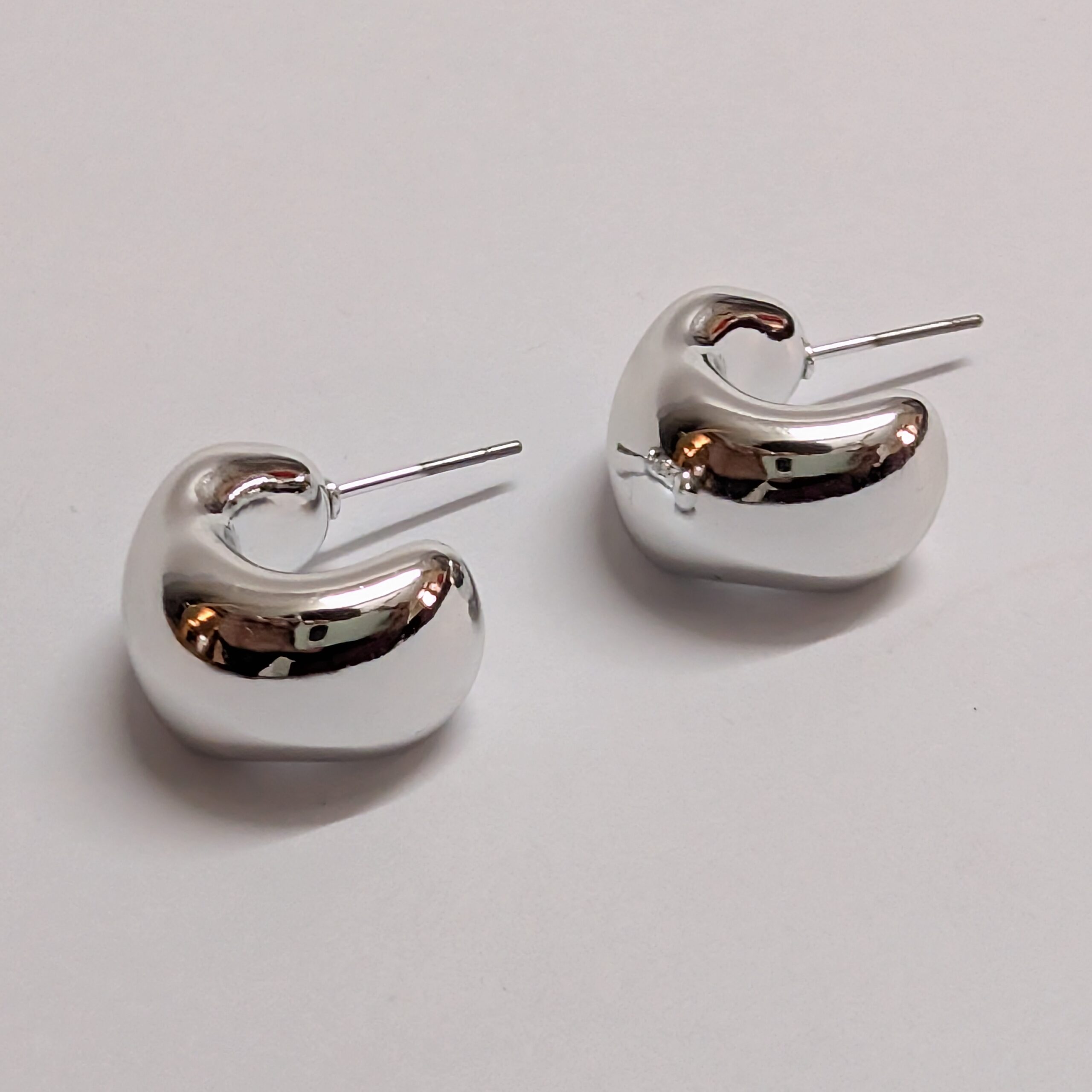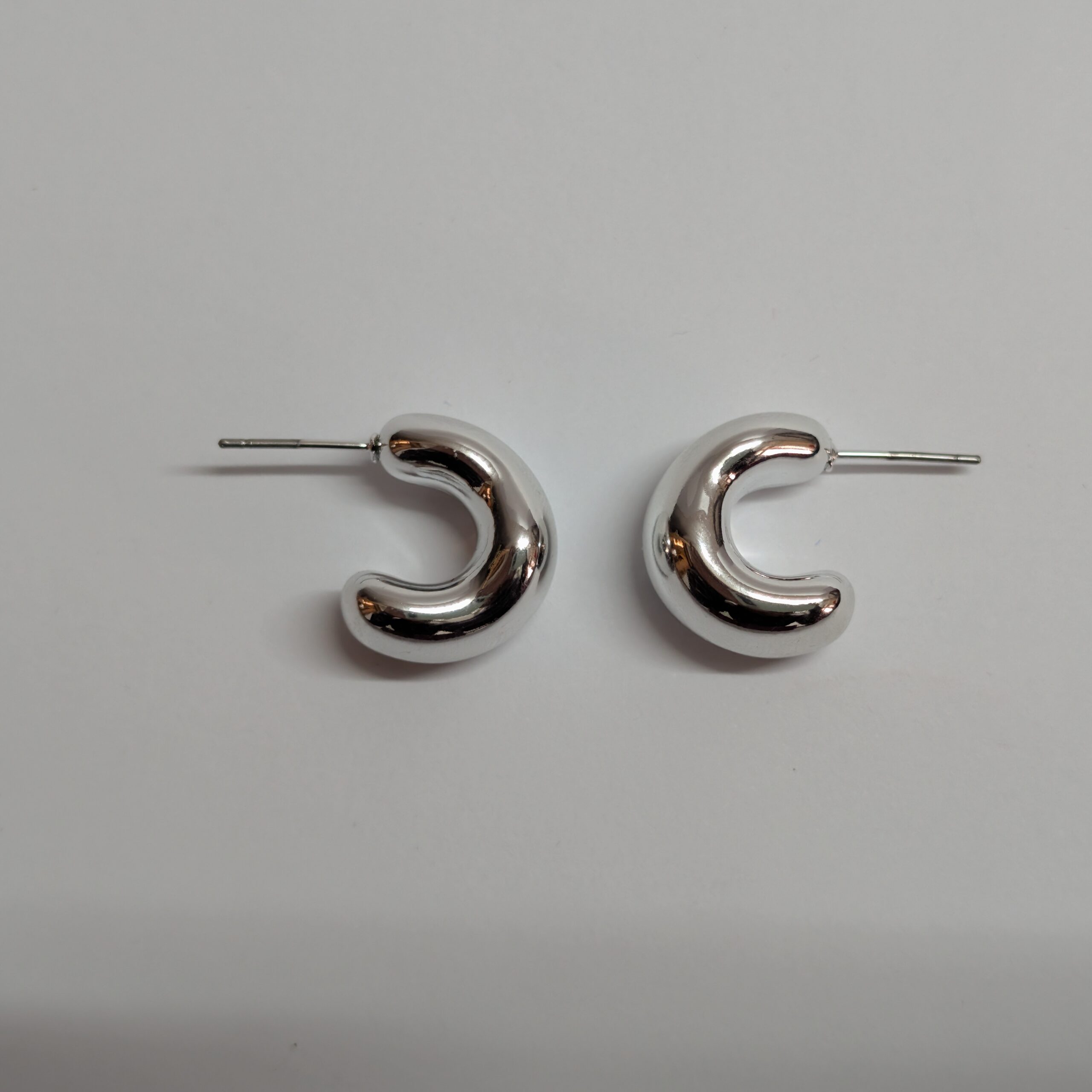 Trendy silver-toned “C” shaped hoops with a thick, tubular design for a bold, high-fashion look.