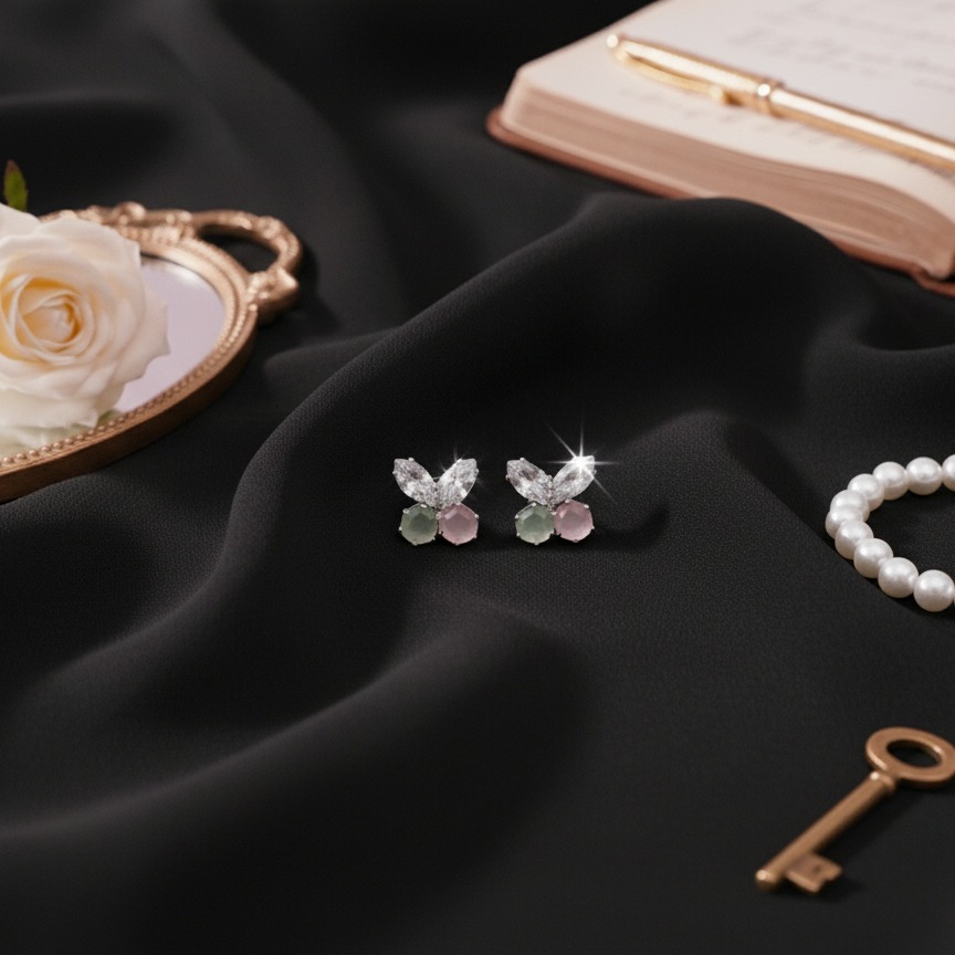 A Symphony of Colours: The design features a creative mix of stone shapes and colours that set these earrings apart. The upper wings are crafted from two brilliant, clear marquise-cut crystals that provide an intense sparkle reminiscent of fine diamonds. The lower wings are represented by two smooth, round stones in contrasting pastel shades?a serene sea-green and a gentle petal-pink. This dual-tone palette is specifically chosen to complement the vibrant and diverse wardrobe of the modern Indian woman, pairing effortlessly with both pastel-coloured ethnic wear and contemporary western outfits.