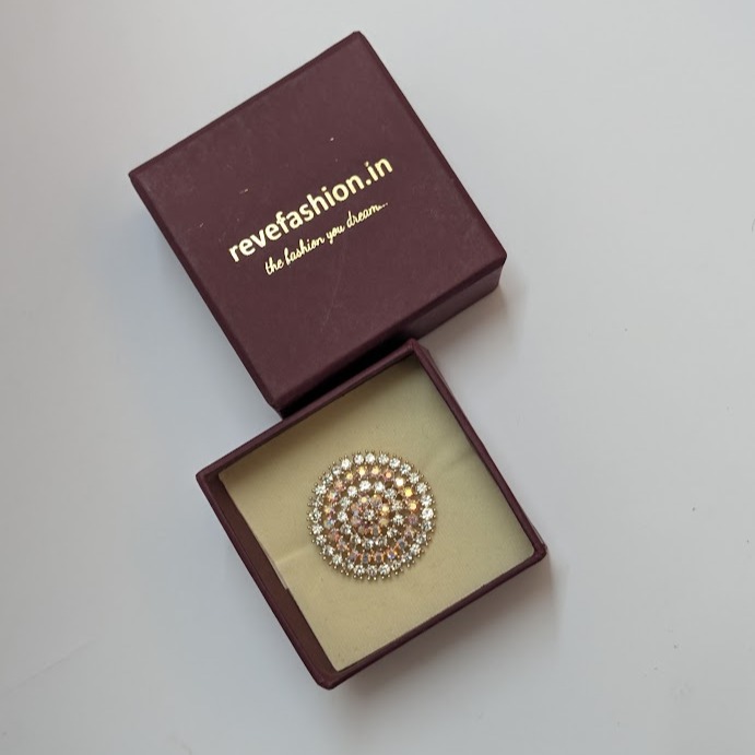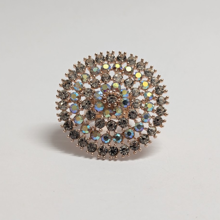 The ring features a large, circular sunburst silhouette encrusted with dozens of precision-cut crystals. At its heart are iridescent “Aurora Borealis” stones that shift beautifully between blues, pinks, and golds as they catch the light, surrounded by a sophisticated halo of smokey-grey and champagne crystals. This multi-tonal palette ensures that the ring complements a wide variety of outfits, from shimmering silver cocktail gowns to rich, vibrantly coloured silk sarees.