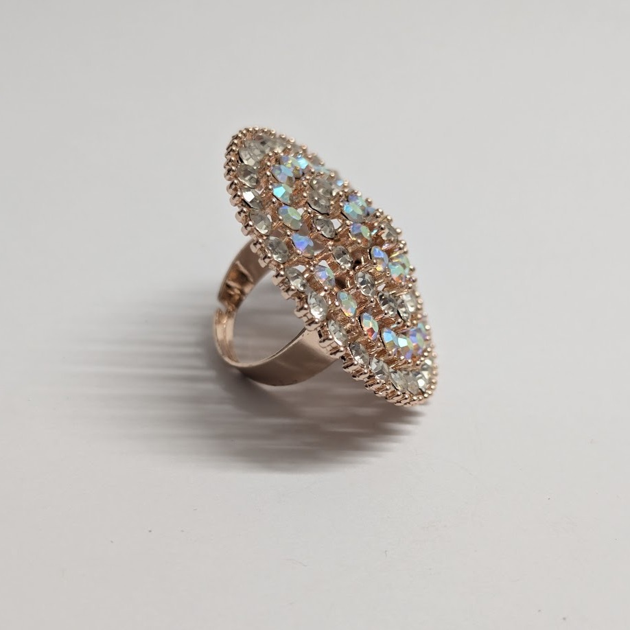 Capture the magic of the northern lights with the Celestial Aurora Statement Ring. Featuring a mesmerizing array of iridescent and smokey-grey crystals set in a radiant rose-gold-toned (non-gold) finish, this sunburst-inspired cocktail ring is a show-stopping accessory. Designed with an adjustable band, it offers effortless glamour for weddings, parties, or high-fashion festive events.