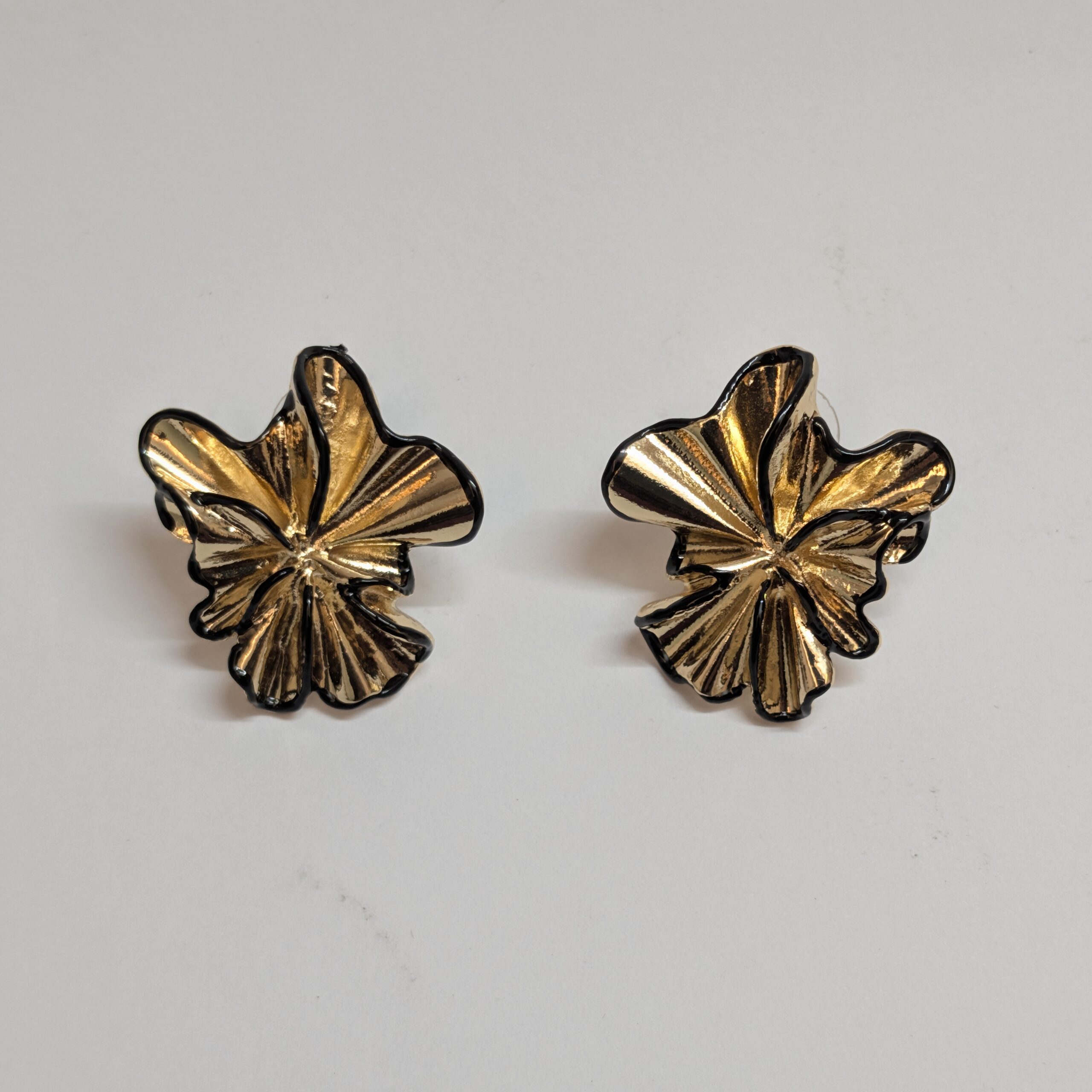 Each earring features a deeply textured, fan-like ruffled surface that mimics a blooming flower. The high-shine gold-toned finish is contrasted beautifully by a delicate black hand-painted edge, which defines the organic shape and adds a touch of “Noir” sophistication. These studs sit comfortably flush against the earlobe, providing a large, eye-catching profile that remains elegant enough for both office power-dressing and evening social events.