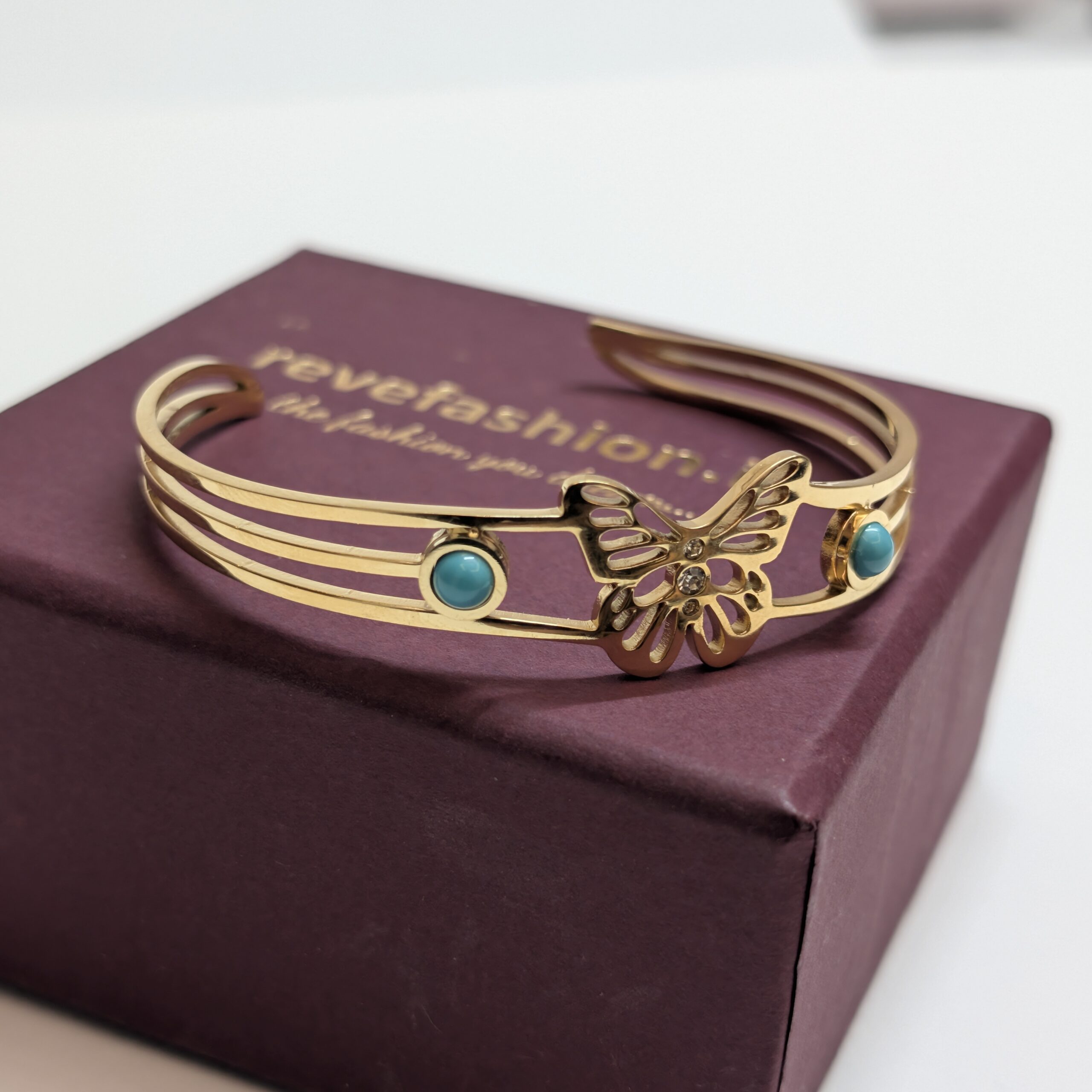 Add a whimsical yet sophisticated touch to your accessory collection with our Golden Butterfly & Turquoise Dream Handcuff. This piece is a masterclass in modern imitation jewellery, designed for the woman who loves accessories that tell a story. Crafted from a high-quality, non-gold imitation alloy, it provides the high-shine, luxurious look of polished gold while remaining durable and lightweight for all-day wear.