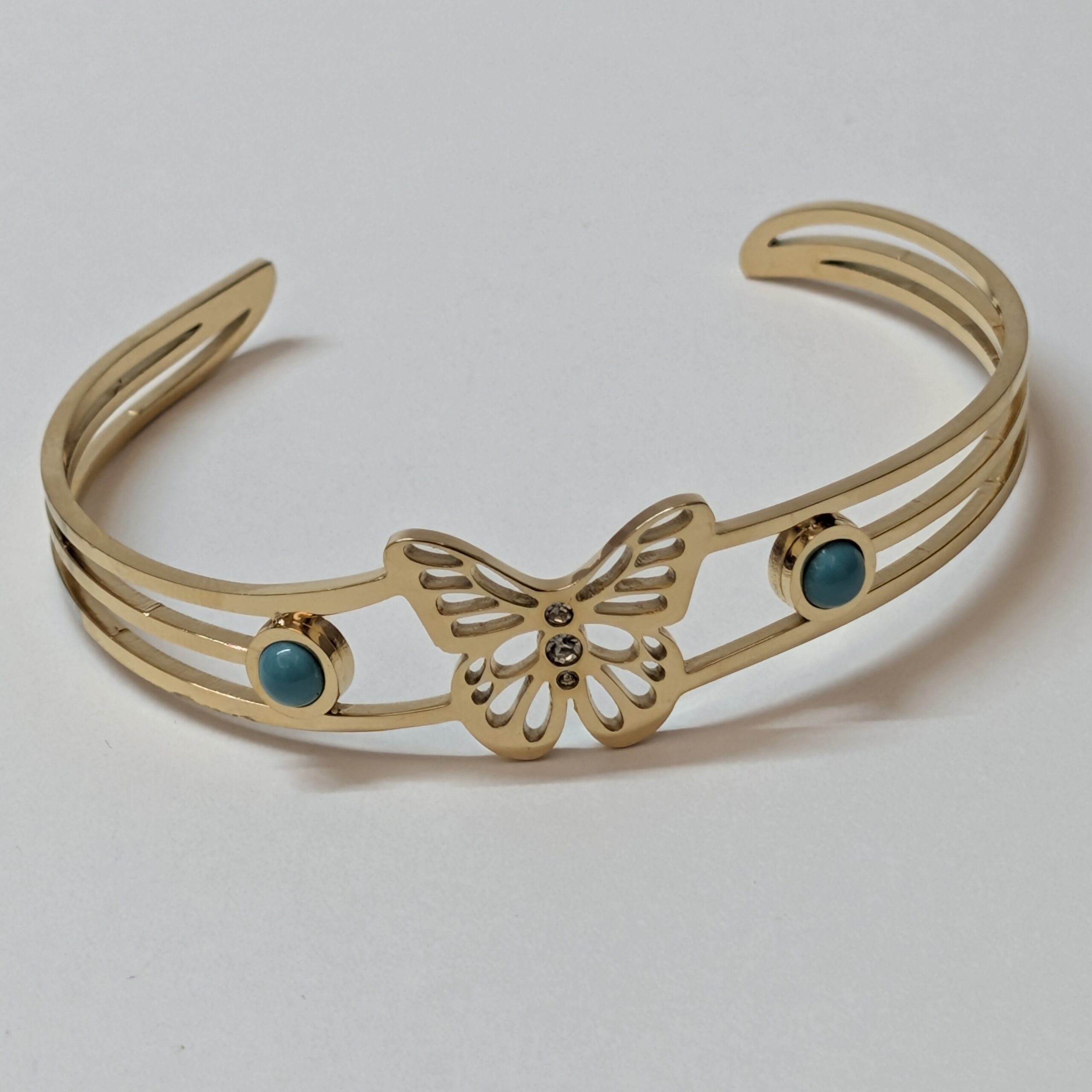 The centrepiece of this cuff is an intricately detailed butterfly motif, featuring open filigree-style wings that evoke a sense of lightness and grace. The body of the butterfly is accented with two brilliant-cut white crystals that provide a subtle, elegant sparkle. Flanking the butterfly are two round, vivid turquoise-coloured beads set in polished gold-toned bezels, offering a beautiful contrast between the warm metallic finish and the cool, earthy blue tones.
