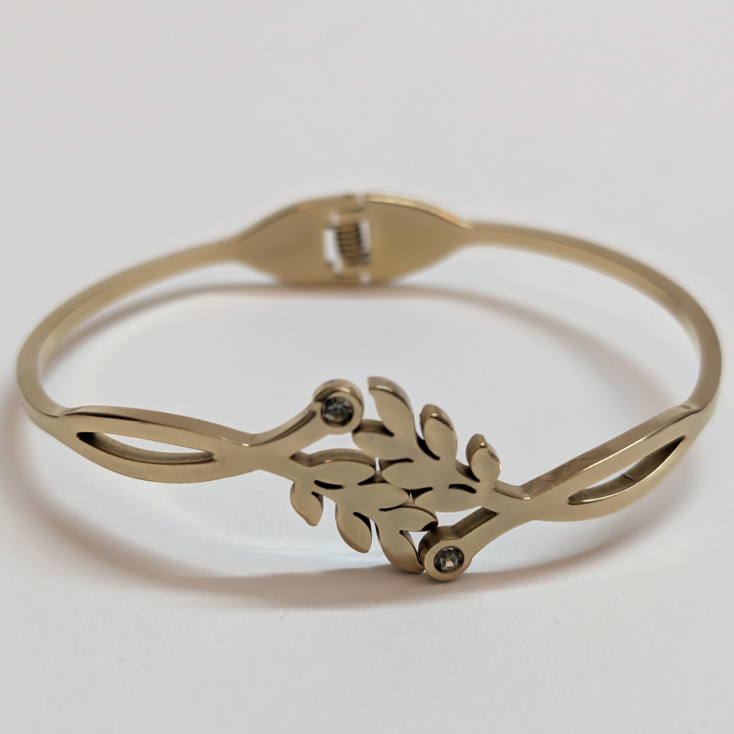 The focal point of the bracelet is a pair of intertwined laurel sprigs that meet gracefully at the centre. Each leaf is polished to a high shine, and the design is elevated by two brilliant-cut micro-crystals set at the base of the stems, providing a subtle, sophisticated sparkle. The sleek, rounded band leads to a sturdy spring-hinge mechanism at the base, ensuring the bracelet is easy to put on and stays securely on the wrist throughout the day.
