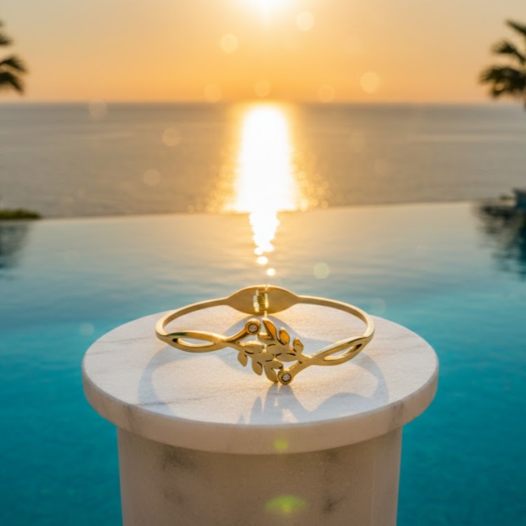 Embrace a touch of Grecian-inspired elegance with the Golden Laurel Leaf Bracelet. Featuring two delicately intertwined leaf sprigs accented with tiny sparkling crystals, this rose-gold-toned (non-gold) imitation bracelet is a masterclass in minimalist design. Its secure hinged closure and sleek silhouette make it an ideal everyday accessory or a sophisticated finishing touch for evening wear.