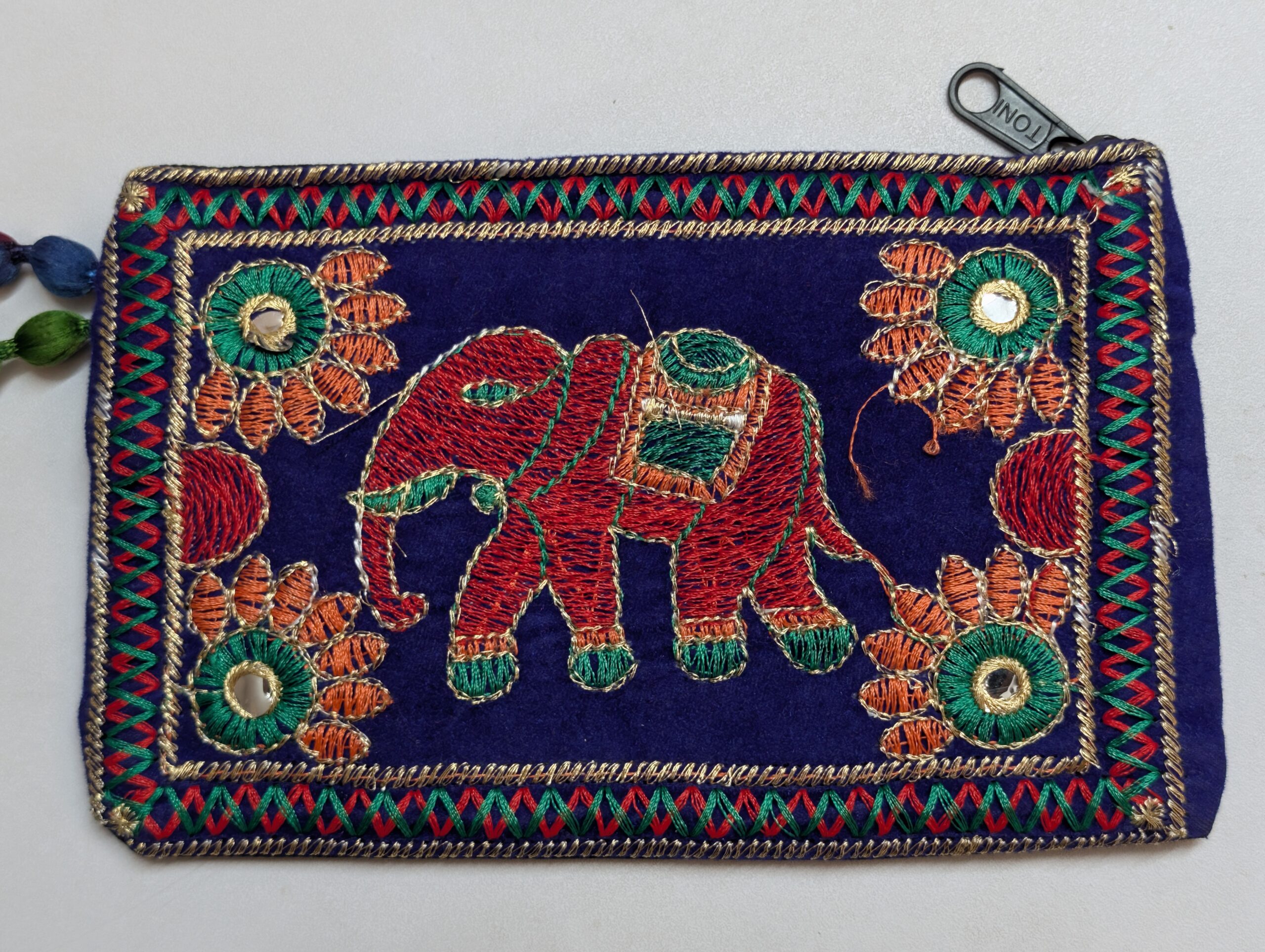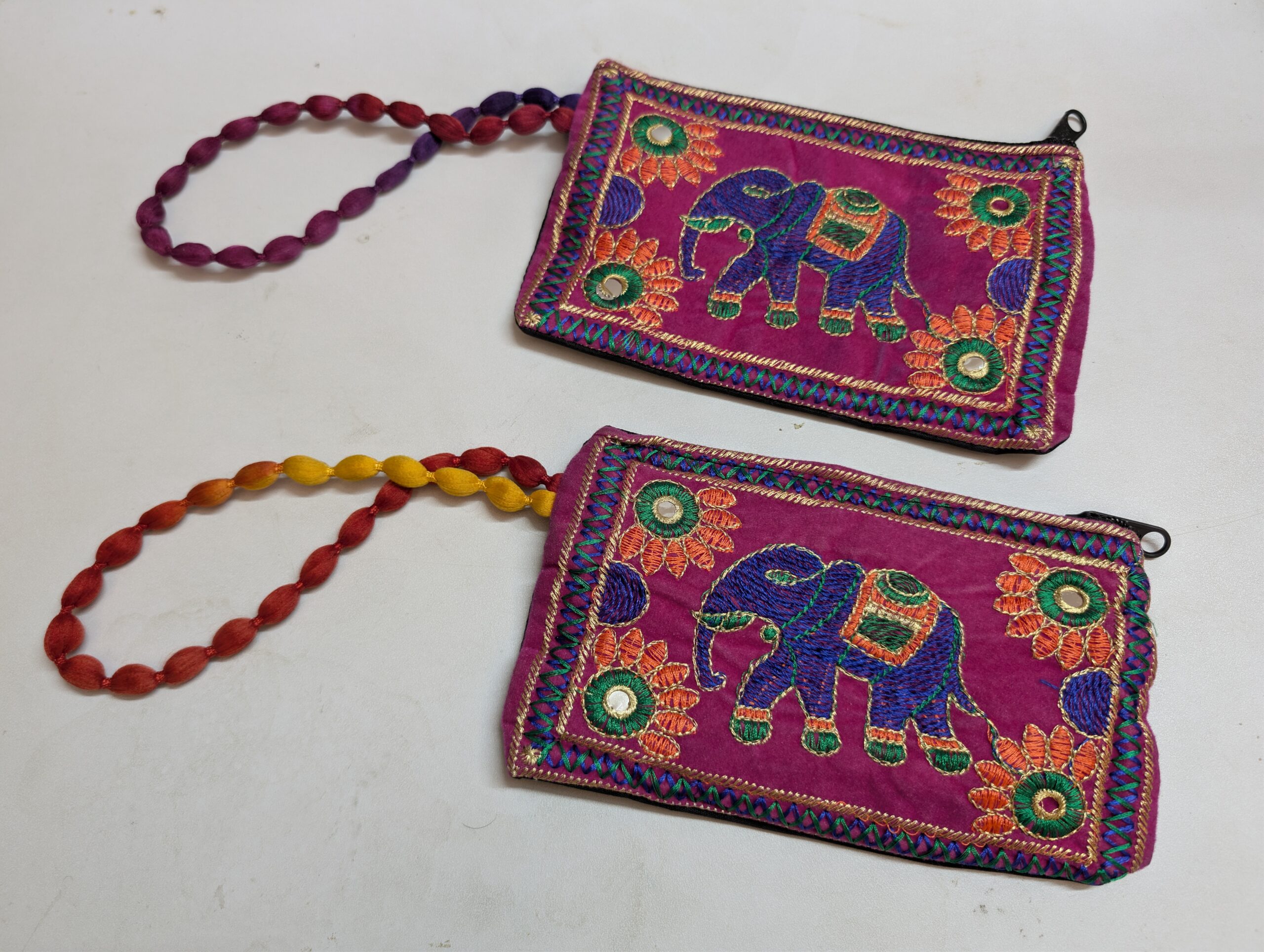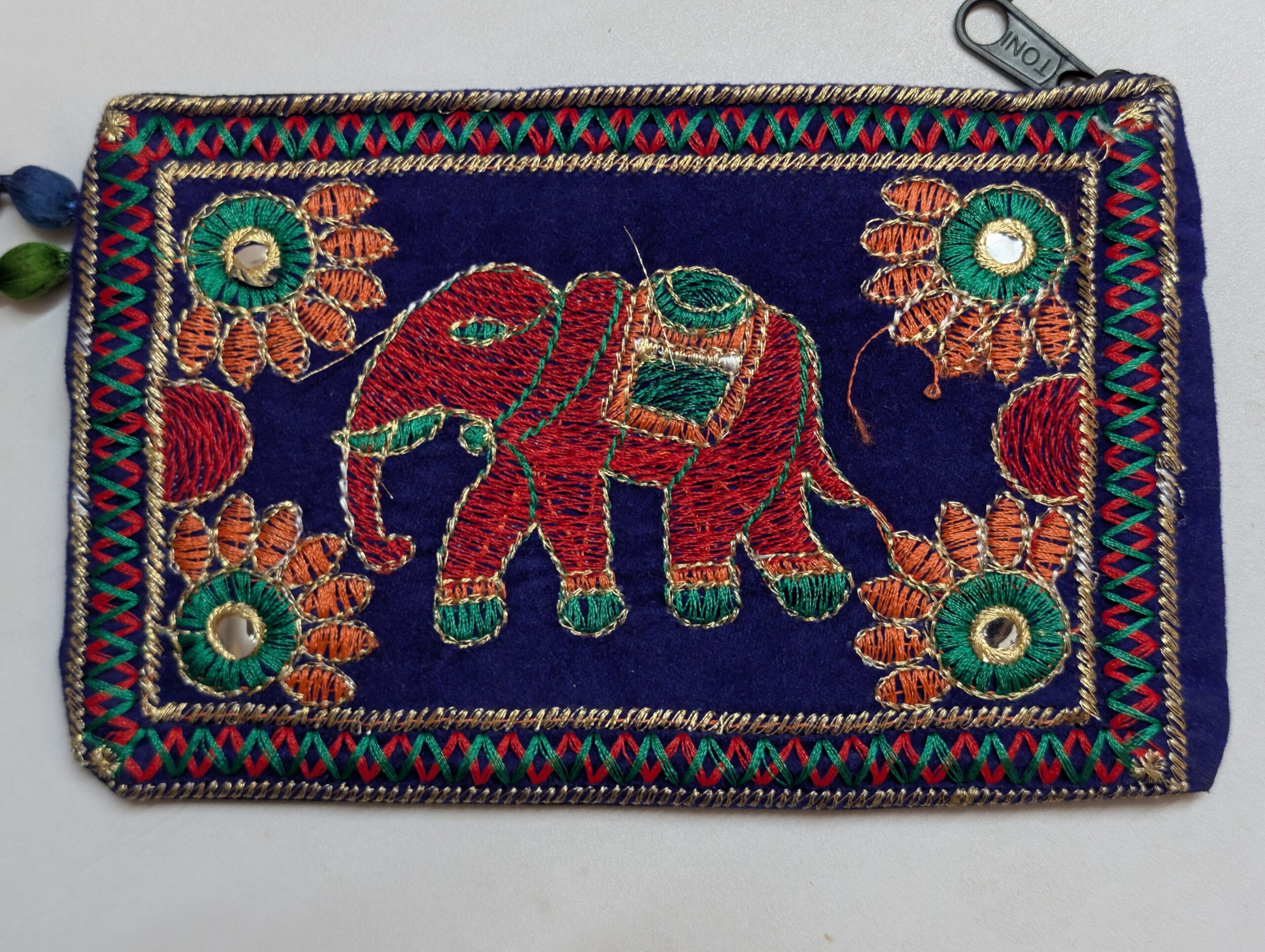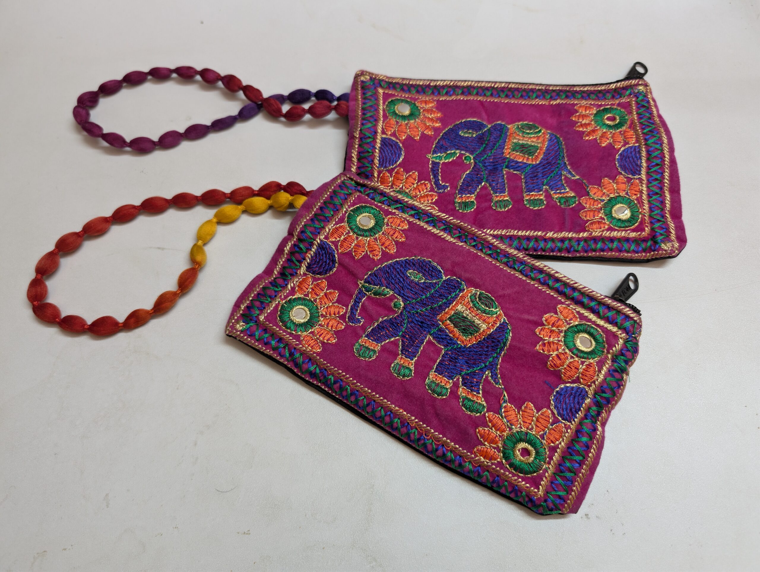 Kutch Heritage Elephant Hand-Embroidered Pouch – Authentic Gujarati Clutch with Beaded Wristlet