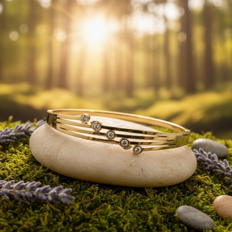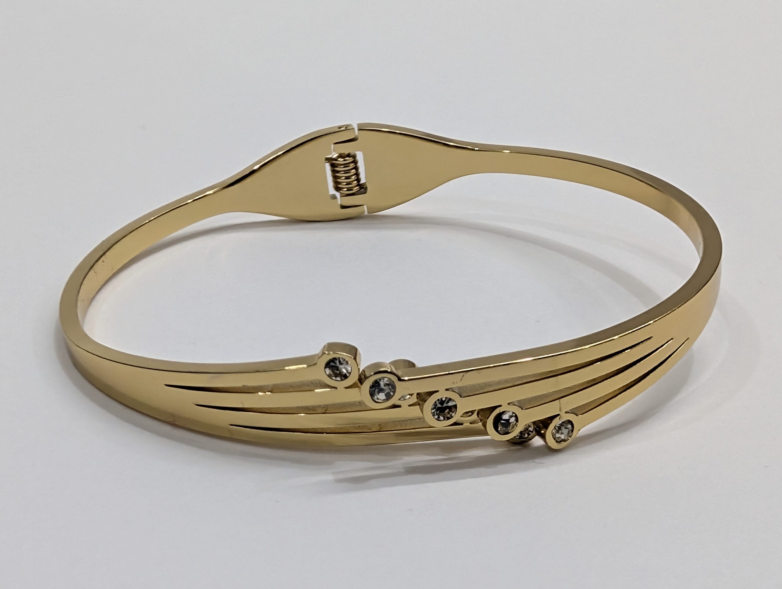 The bangle’s design is defined by its unique asymmetrical triple-stripe focal point. The polished band splits into three elegant, parallel lines that taper gracefully, creating a sense of fluid movement. These “stripes” are punctuated by five brilliant-cut crystals in graduated sizes, each held in a secure bezel setting. This linear arrangement of stones provides a sophisticated, modern sparkle that is more understated and refined than traditional cluster designs.