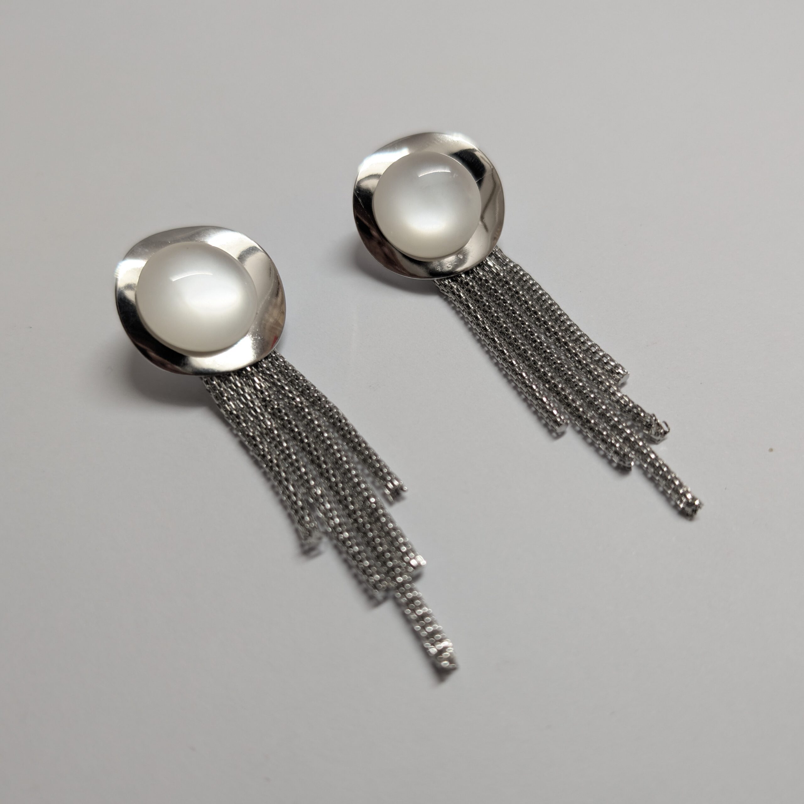 Lunar Cascade Silver Statement Earrings ? Luminous Cabochon Studs with Fluid Mesh Fringe