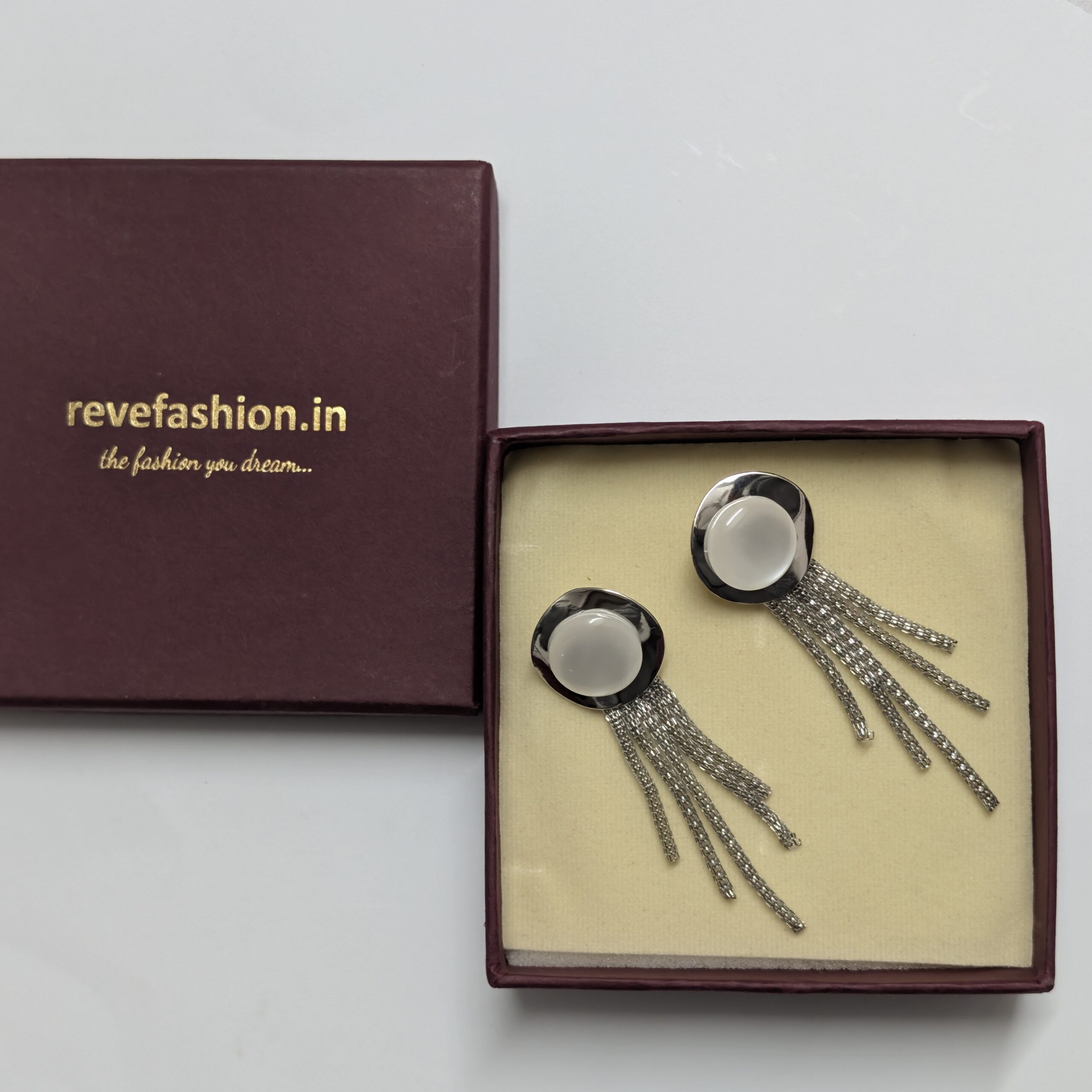 Make a sophisticated statement with the Lunar Cascade Silver Earrings. These stunning non-precious imitation studs feature a luminous, milky moonstone-style cabochon framed by a sleek, silver-finished rim and finished with a dramatic waterfall of fluid mesh chains.