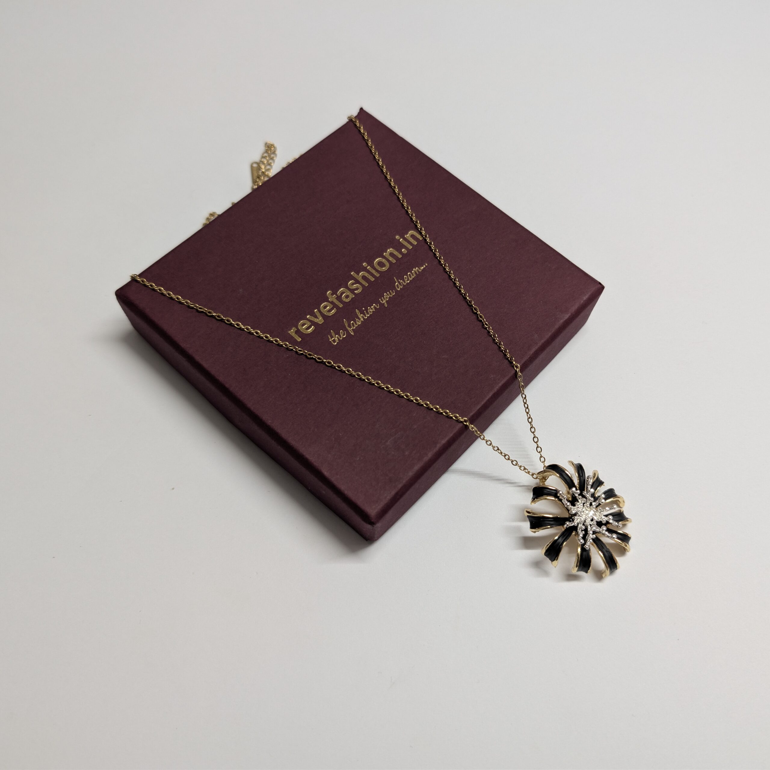 Make a bold statement with the Midnight Starburst Floral Necklace. This striking piece features a large, sculptural flower pendant with black-enameled petals and a brilliant crystal-encrusted center. Suspended from a polished gold-toned chain, it?s the ultimate accessory for adding high-fashion drama to your evening ensemble.