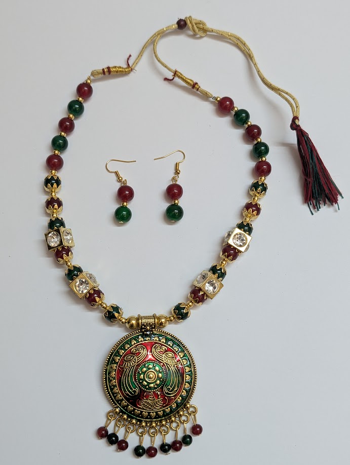 Peacock Meenakari Antique-Finish with Beaded Mala and Earrings