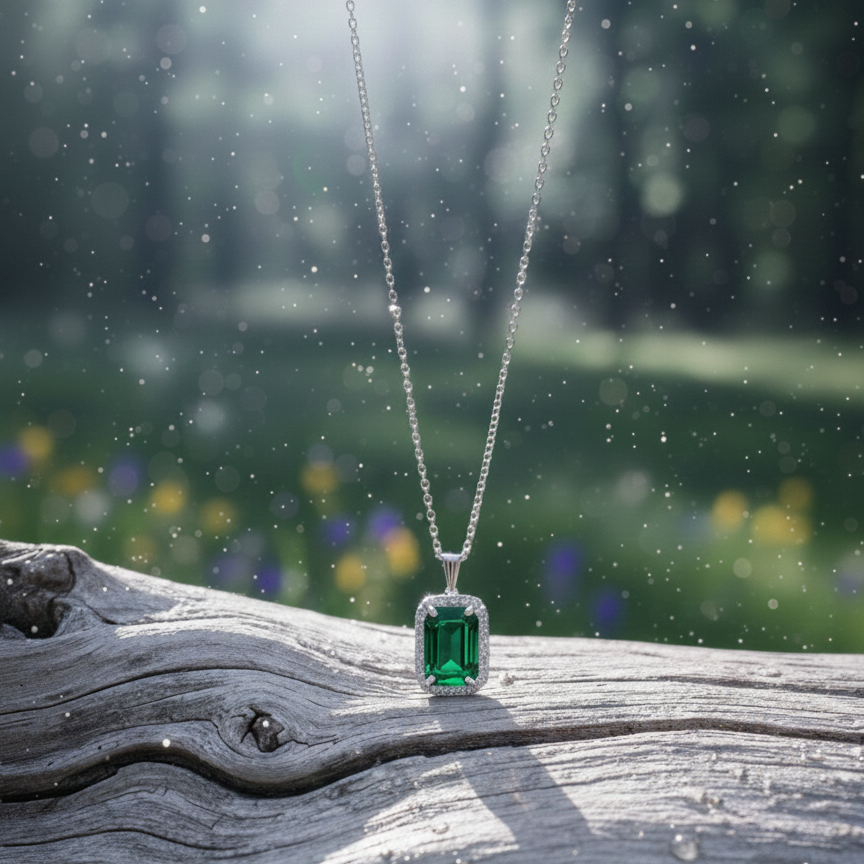 Capture the essence of heritage luxury with this stunning Emerald-Green Radiant-Cut Pendant. Featuring a deep forest-green lab-created centre stone framed by a double row of shimmering crystals, this silver-toned necklace is the ultimate statement piece for festive celebrations and evening soir?es.